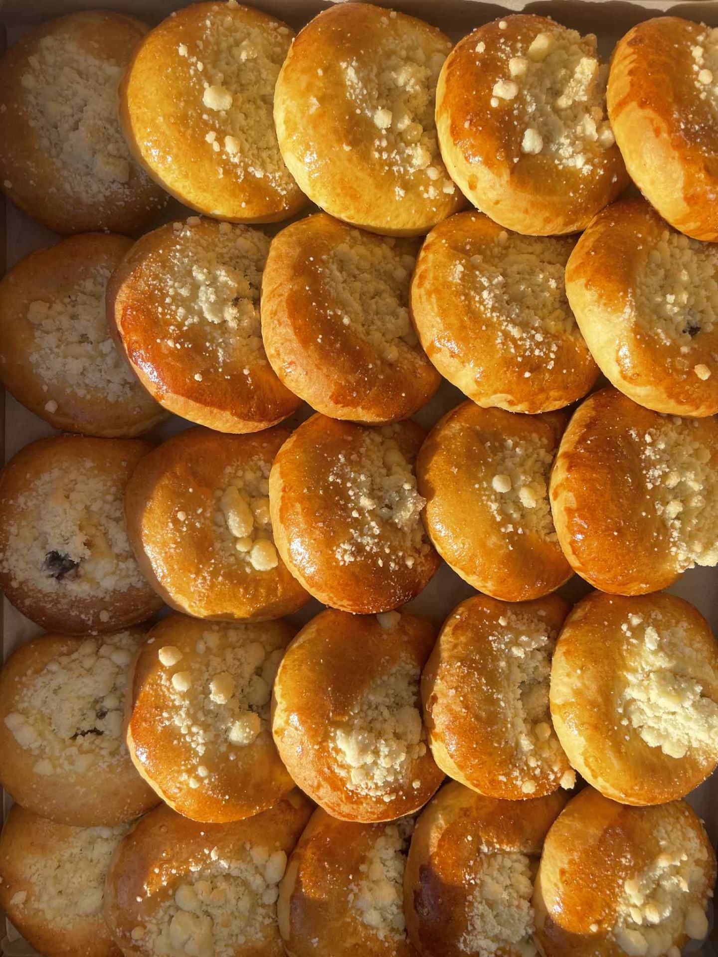 Frgále pečeme pouze borůvkové, každý den kromě neděle, stejně jako koláčky. Obojí lze objednat (menší počet) i jeden den předem, pokud již není náš maximální denní limit 200 ks koláčků naplněn. Velké objednávky přijímáme na zálohu, stačí den předem, nebo využijte náš e-shop.