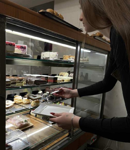 Naši návštěvníci přicházejí primárně na kávičku se zákuskem, který chtějí fyzicky vidět, nebo pro zákusky s sebou. Proto se nám osvědčil již letitý systém, kdy si vždy nejdříve přímo u pokladny vyberete a hned zaplatíte.