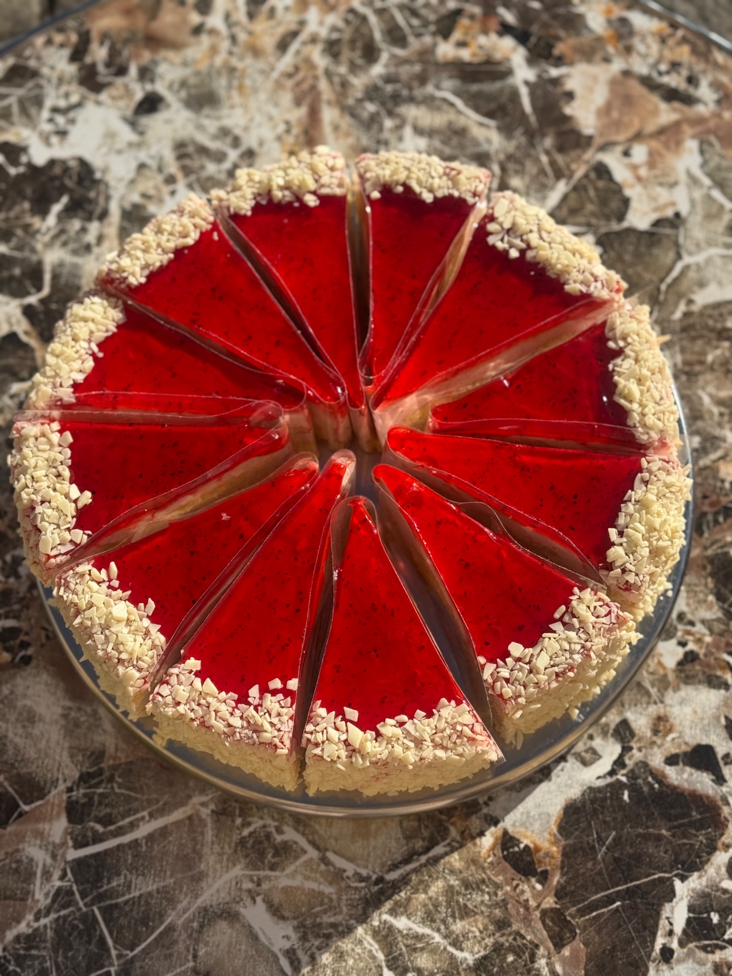 kakaový korpus, tvaroh, jahody, obsypaný bílou čokoládou