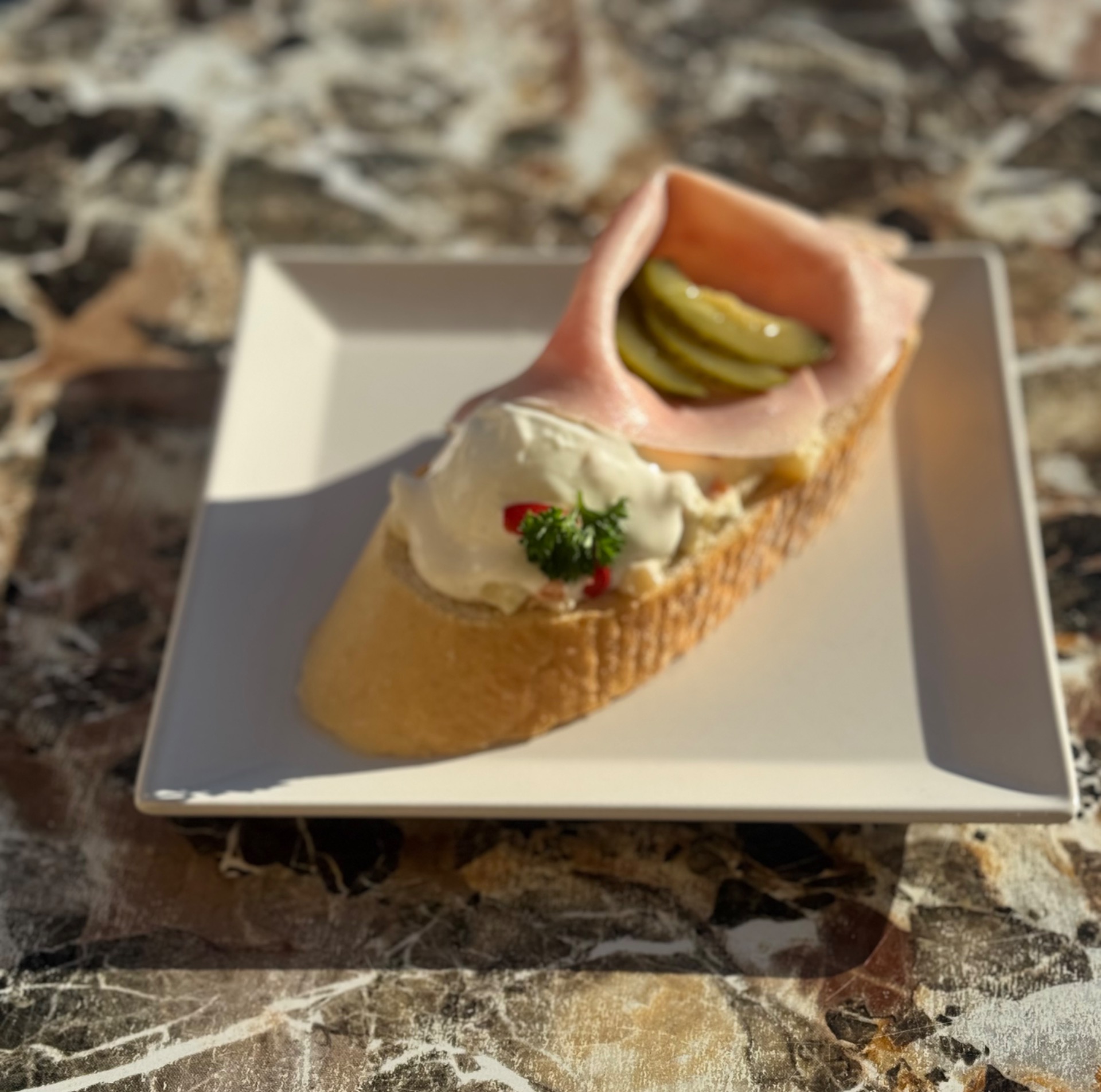 Chlebíček s bramborovým salátem, plátkem šunky, polovinou vařeného vejce s přelivem z tatarské omáčky, sterilizovaná okurka a kapie.