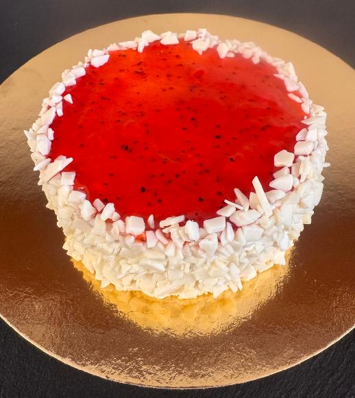 • piškotový korpus, tvarohový jahodový krém, jahodový přeliv, obsypaný bílou čokoládou