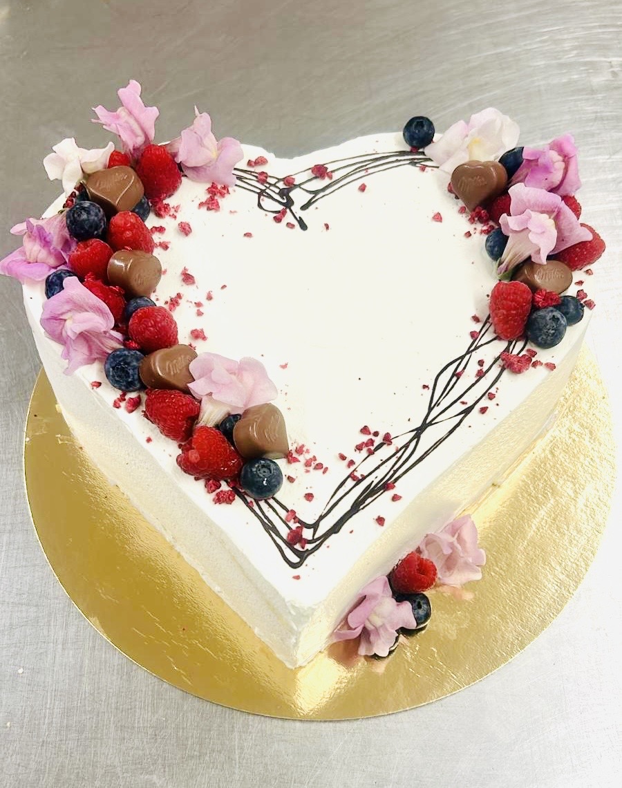 • kakaový korpus, smetanový malinový krém, zdobené ovocem a bonbónky