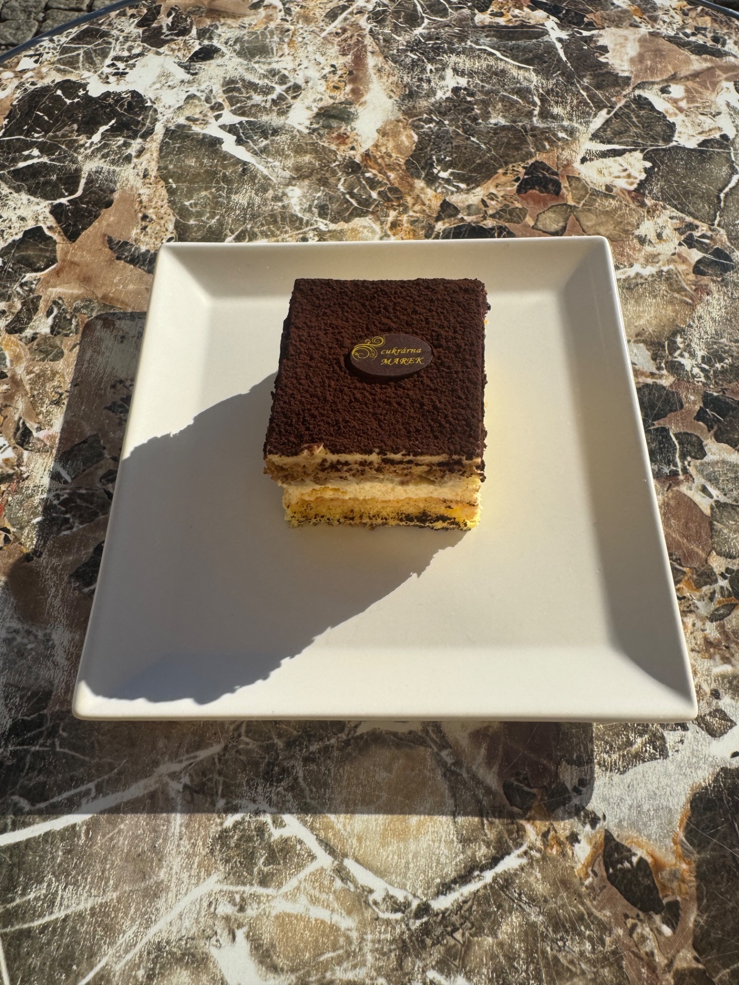 Piškotové těsto, mascarponový krém, káva, kakaový přesyp